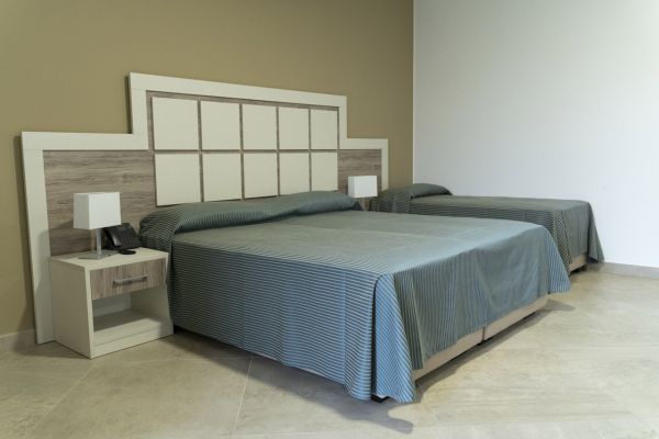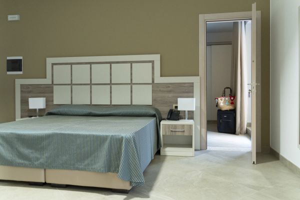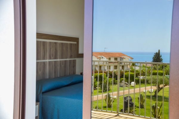 All of them are located on floor 0 of the building and have a mezzanine view. They all consist of a double bed with a room divided by a walk-in wardrobe behind which are 2 separate low beds. Only in 2 of them it is possible to have a cot in the double room and a small bed in a separate room. They have a comfortable small terrace with park or sea view (with supplement).