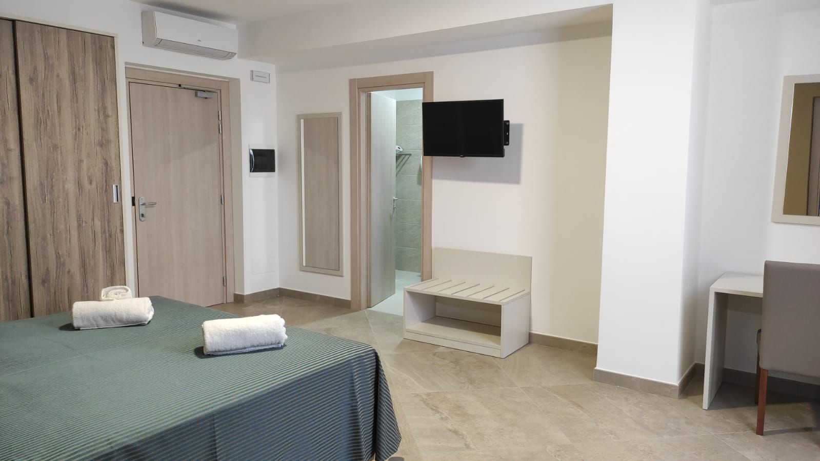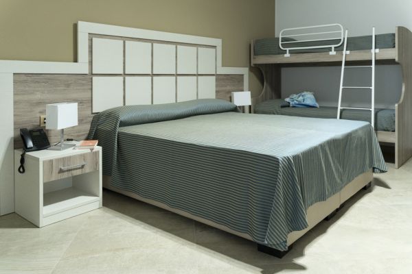 The Grand Family Room 6 people is located on the 1st floor and has a long terrace overlooking the street. It consists of a double bedroom connected to a quadruple room (separable double bed + bunk bed). Two bathrooms and double access from the outside make this room the perfect solution for large families. Possibility of a cot in the double room.